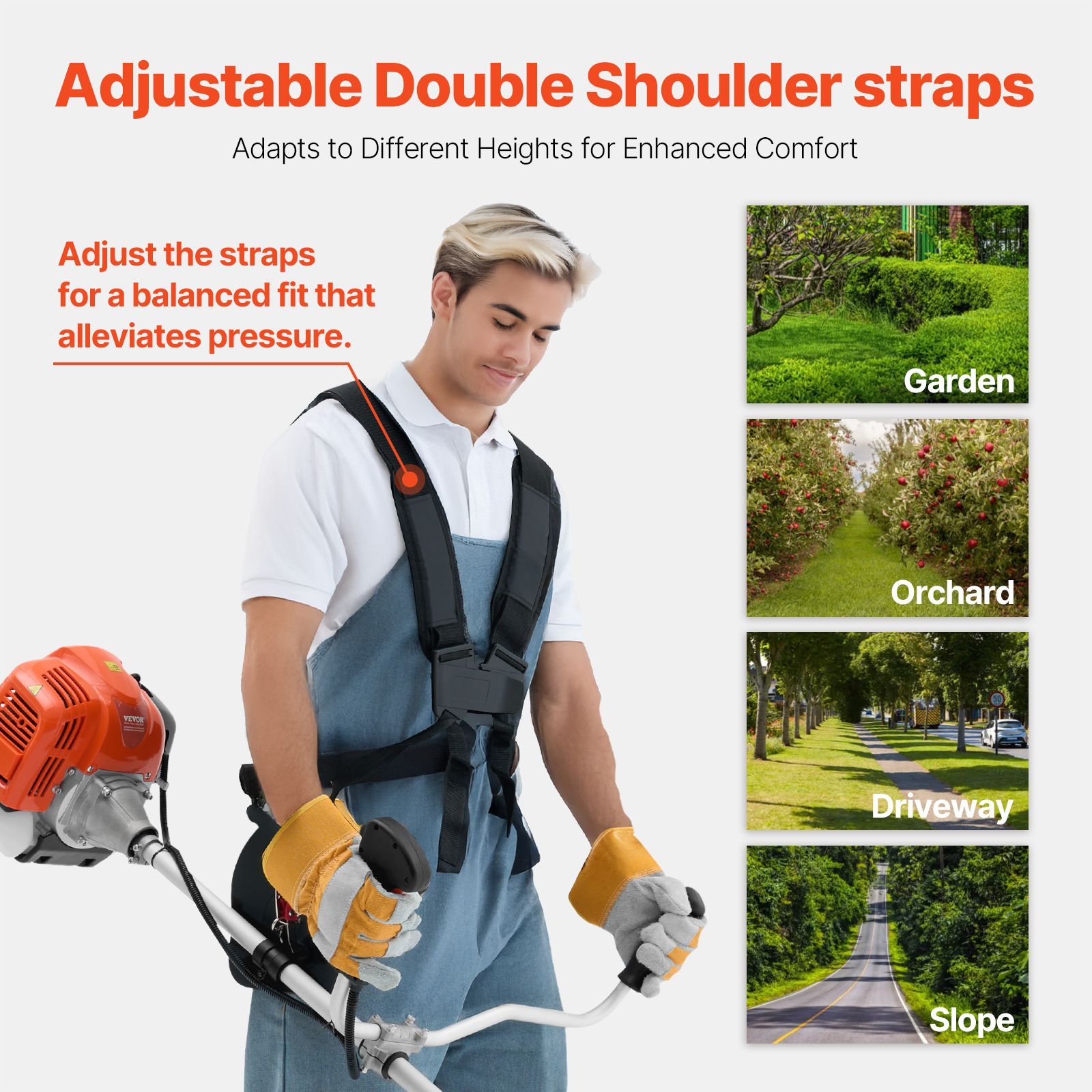 This fuel-powered string trimmer includes various ergonomic features such as a U-shaped handle, shoulder strap, and detachable split shaft for a comfortable weeding experience. The debris shield effectively prevents splashes, ensuring safety and comfort during use.